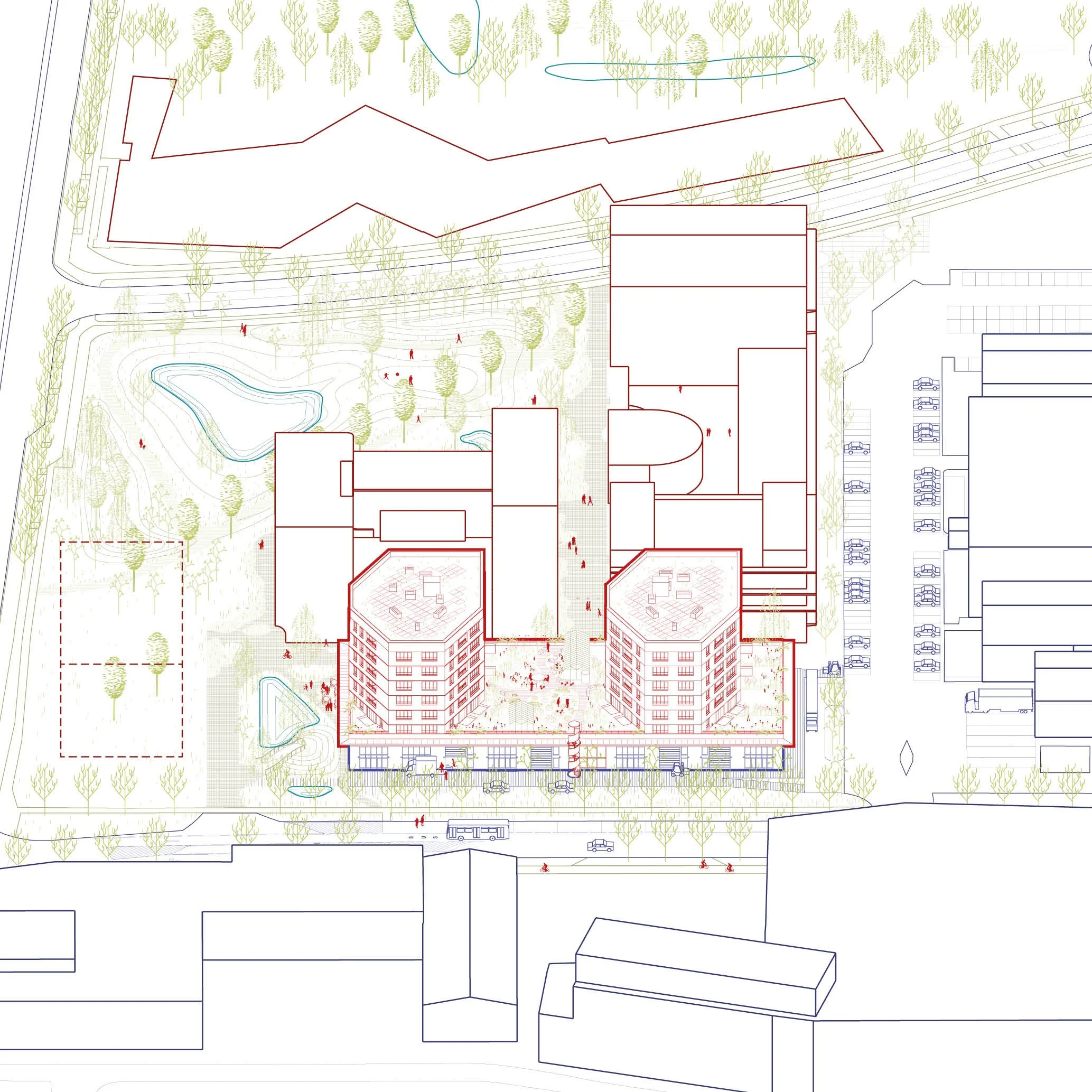 BRUSSEL - VIEW - project win! - The combination of housing and productive spaces requires a careful separation and integration of different streams: the weaving together of the layered worlds of working and living above. The landscape is composed of a logistical platform, an extension of the park and a communal roof garden.