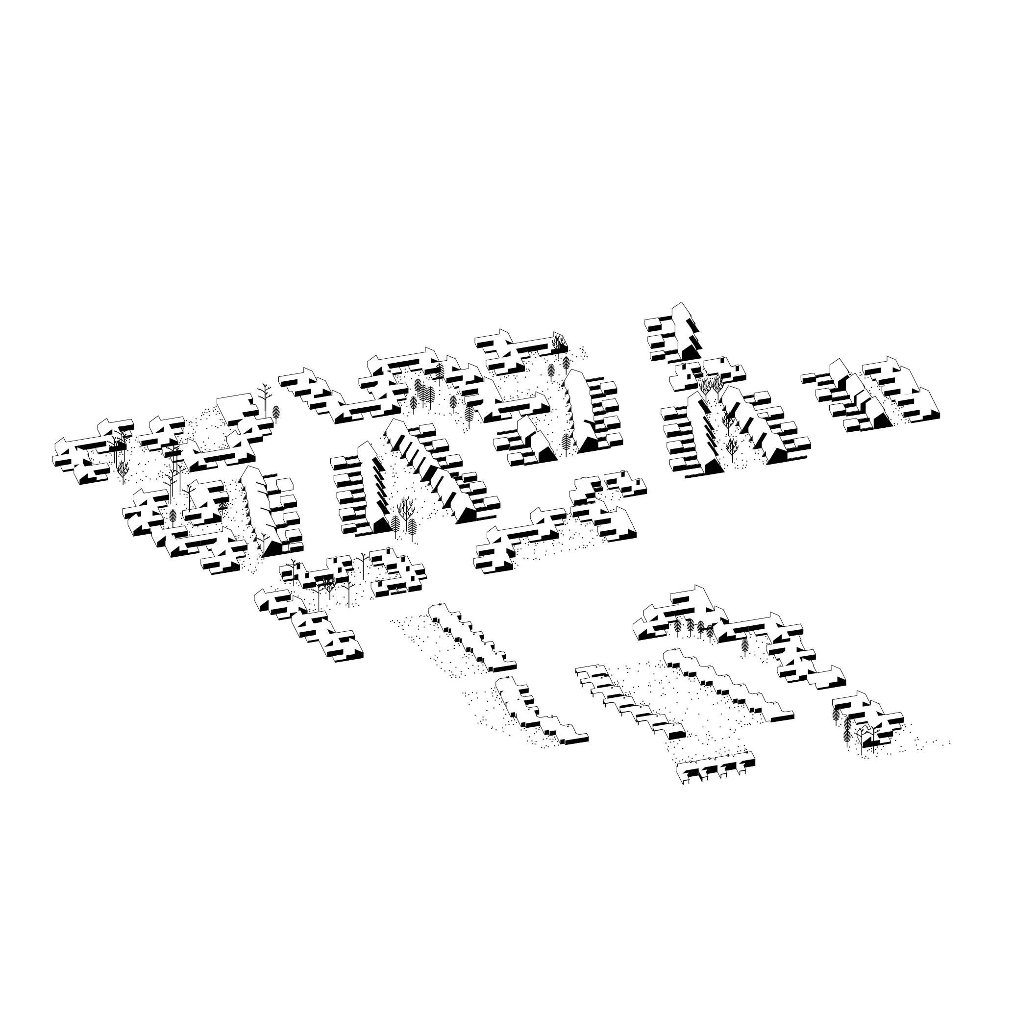 De sterke structuur van de wijk kunnen we gebruiken om nieuwe patronen in de wijk te introduceren en een hiërarchie te creëren. Als een circulair proces levert de transformatie van het ene patroon de materialen om het volgende patroon te realiseren. De nieuwe patronen in de wijk starten vanuit een verandering van het gebruik van de bestaande straten naar gedeelde groen-blauwe straten. De centrale park-as verzamelt activiteiten voor de hele wijk. De collectieve tuinen worden echt uitgerust als tuin. De natuurlijke rand vormt de hoofddrager van een grote ecologische transformatie die zich vertakt in elk patroon. Het nieuwe patroon integreert schakeringen van publiek – naar collectief – naar samen – naar privaat.